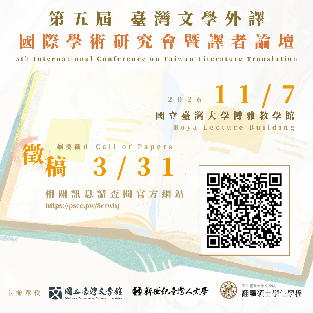 2026年11月7日假國立臺灣大學博雅教學館舉辦「第五屆臺灣文學外譯國際學術研討會」,本屆主題為「路徑與藍圖——臺灣文學在全球文學場域的航行與重構」。