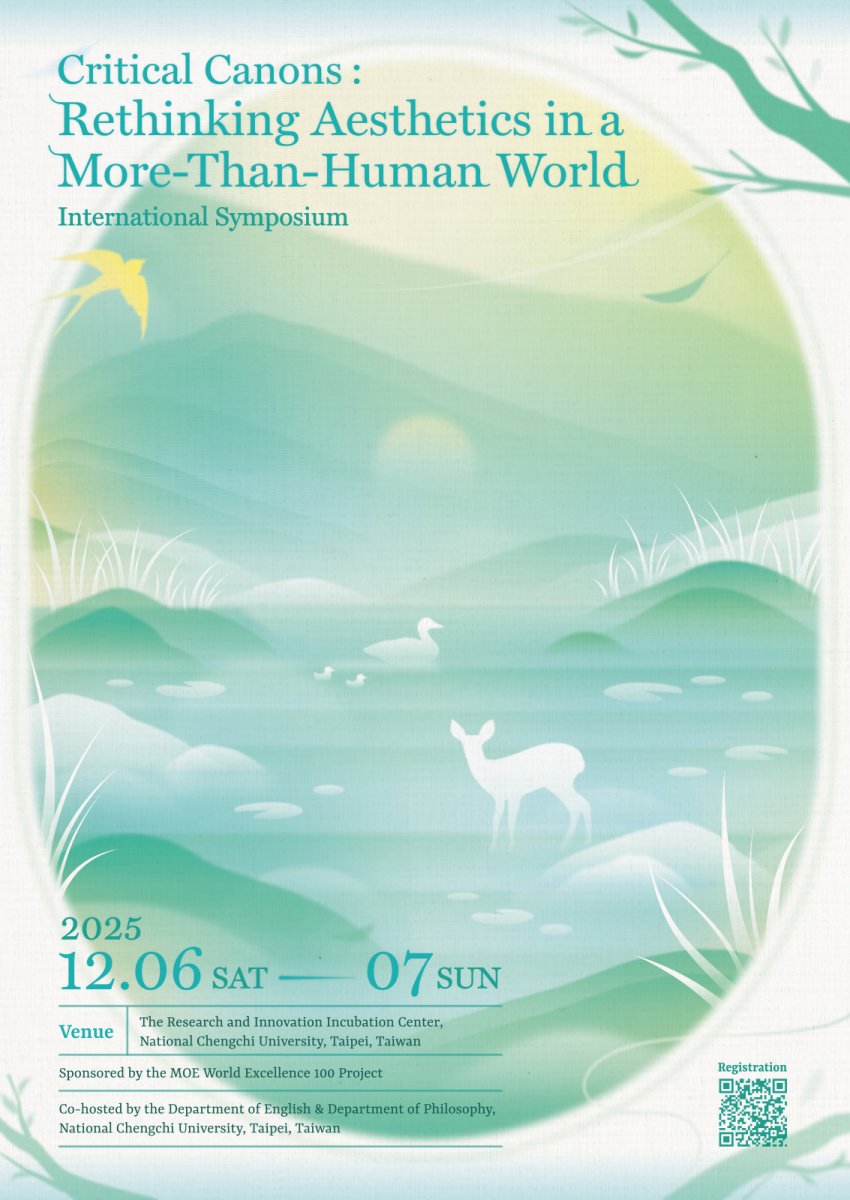 The Department of English and the Department of Philosophy at National Chengchi University (NCCU) are pleased to announce the 2025 International Symposium “Critical Canons: Rethinking Aesthetics in a More-Than-Human World,” to be held on December 6–7, 2025, at NCCU’s Research and Innovation Incubation Center (RIIC) in Taipei, Taiwan.